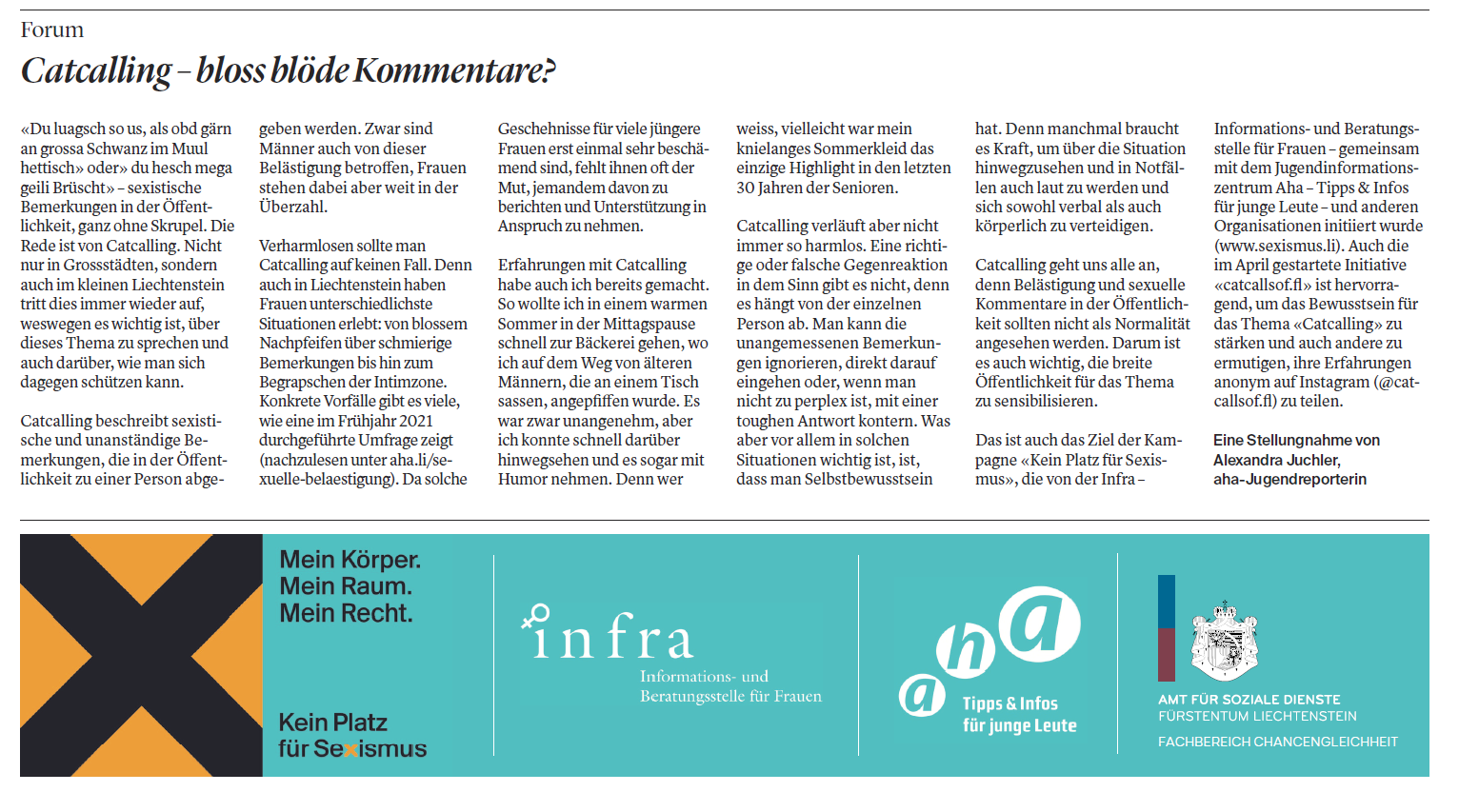 Die Kampagne «Kein Platz für Sexismus» setzt bei der Belästigung im öffentlichen Raum an. Sie wurde auf Initiative der infra und dem aha (Tipps und Infos für junge Leute) gegründet und gemeinsam mit dem Fachbereich Chancengleichheit des Amtes für Soziale Dienste, dem kantonalen Kompetenzzentrum Integration und Gleichstellung (KIG) St. Gallen sowie der Abteilung Chancengleichheit Appenzell Ausserrhoden lanciert.