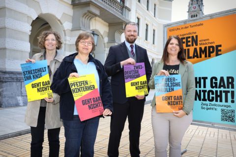 Die Organisatorinnen der Kampagne für Zivilcourage gegen Sexismus in Liechtenstein Karin Zürcher (infra), Ute Mayer (Amt für Soziale Dienste) und Mirjam Schiffer (aha) mit Regierungsrat Emanuel Schädler.